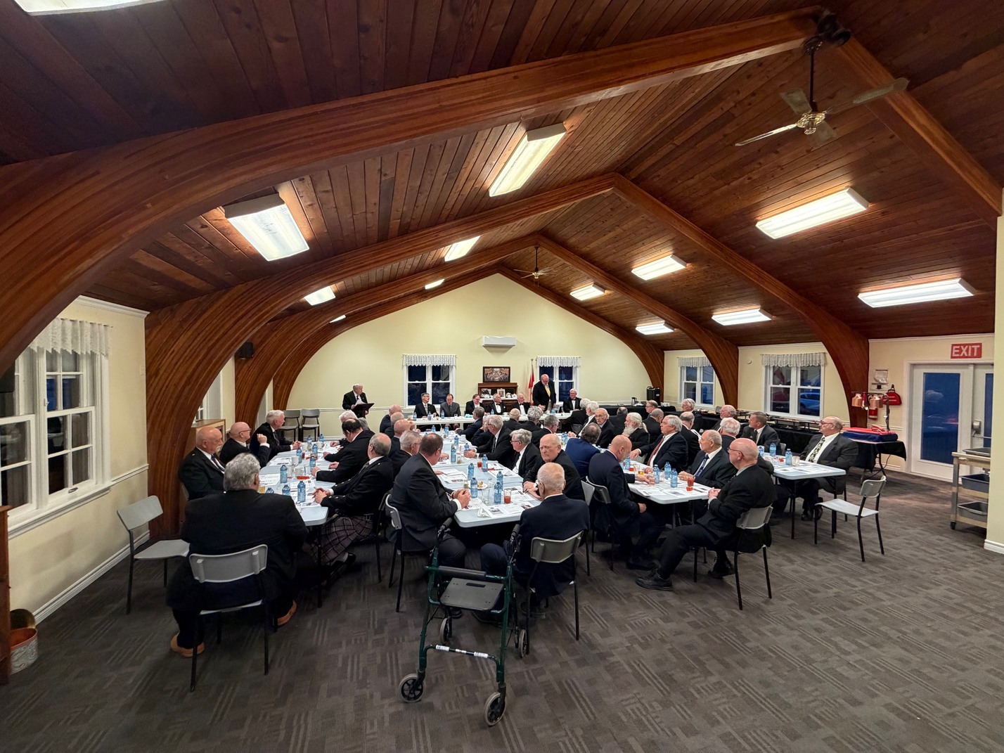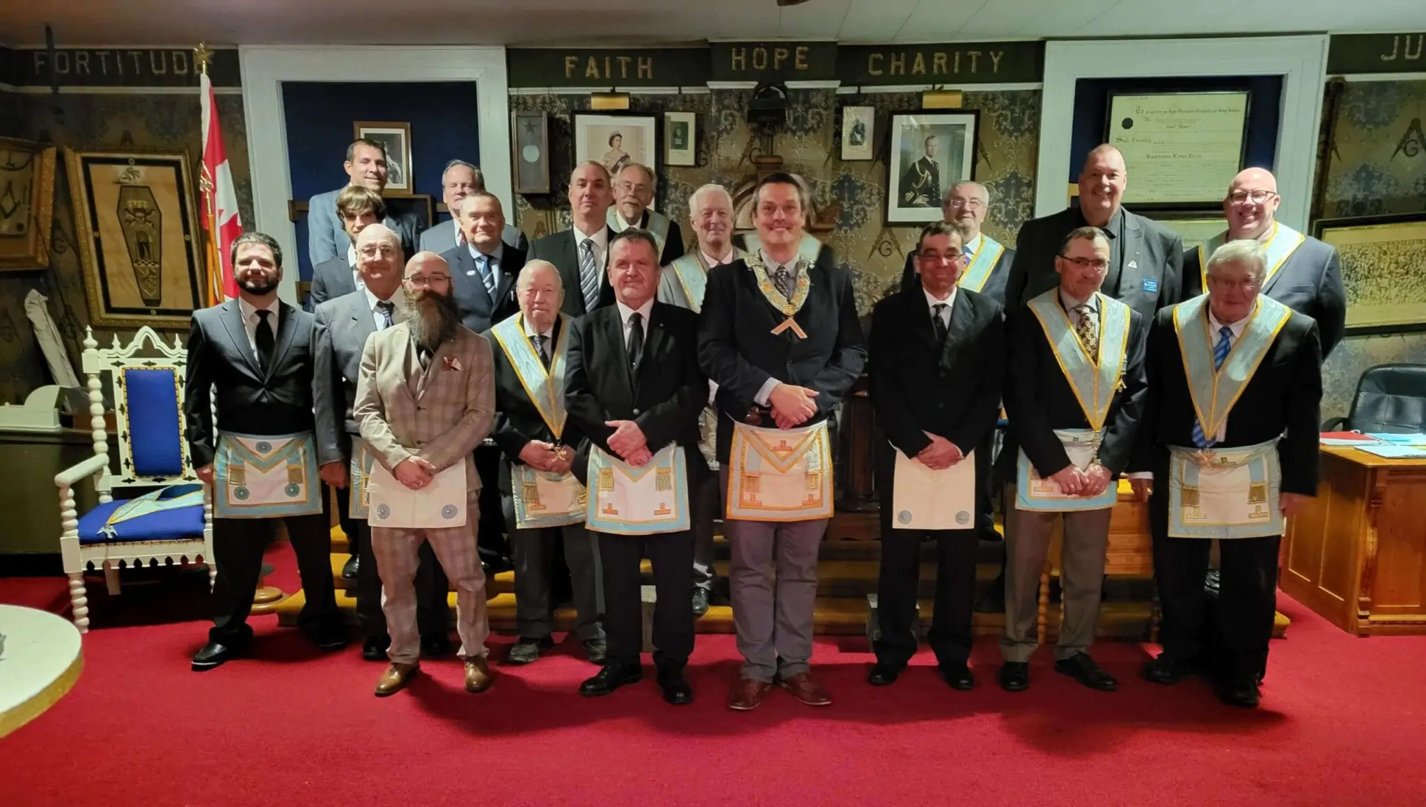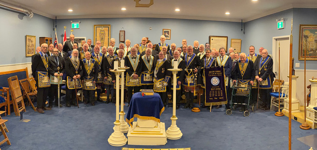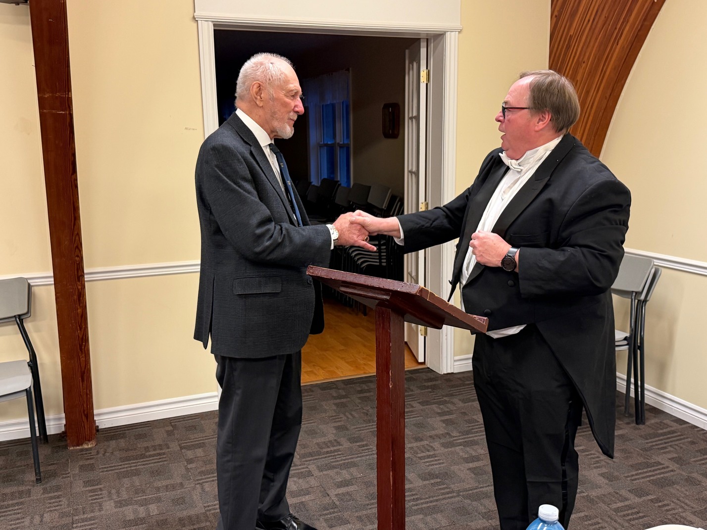 January 7th 2025 our Director of Ceremonies, Wor. Bro. Charles Osborne, escorted Wor. Bro. Gordon Gordon to the East where R. Wor. Bro. Gary MacGregor had the honour to present a 60 year pin to Wor. Bro. Gordon while our Master, Wor. Bro. Trevor Kane, (the tall one) read the card from Grand Lodge.